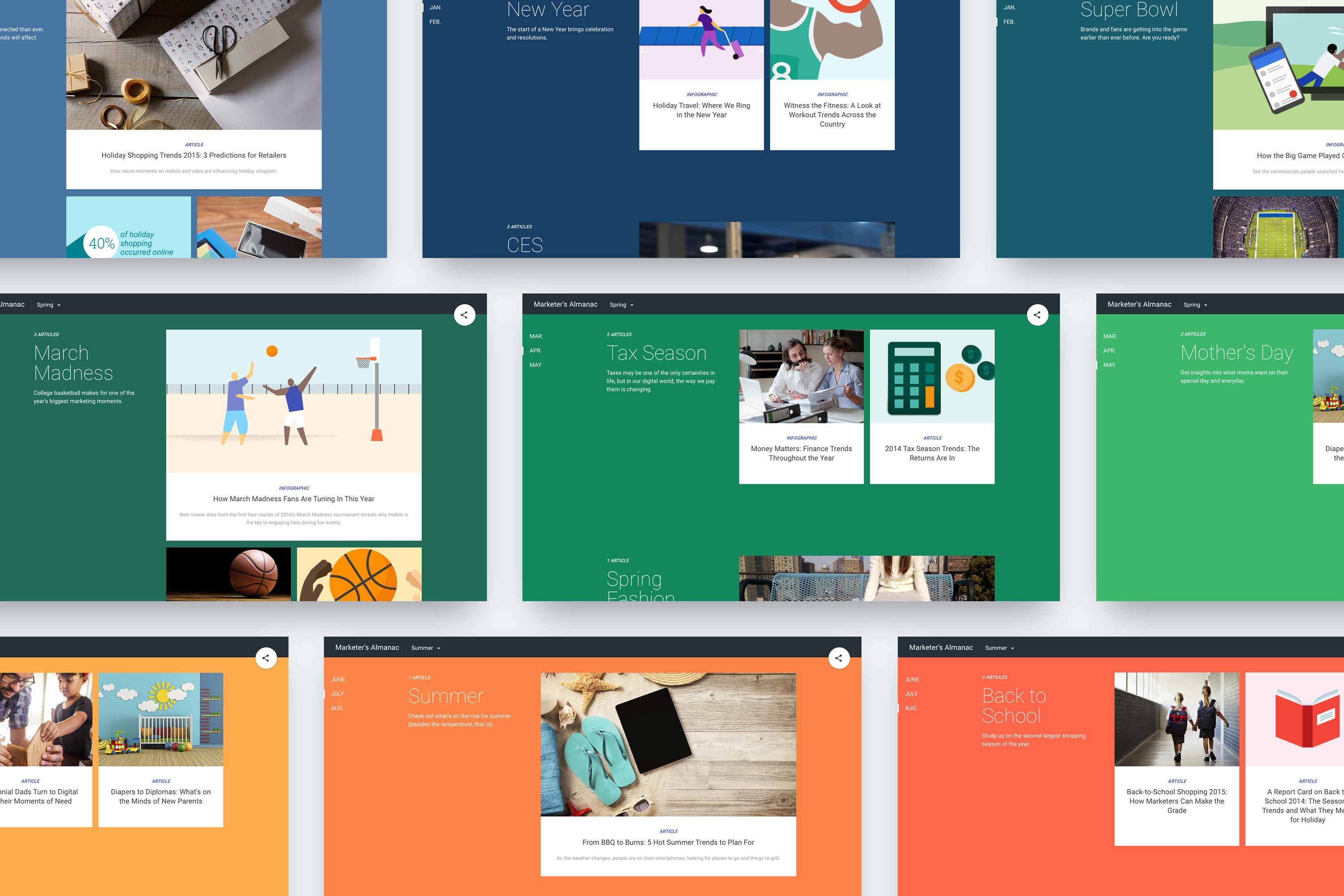 To refresh the most used tool offered by Think with Google, we created an explorable year-long calendar to help marketing professionals plan for events and seasons, supported by unique insights from Google data. We developed playful hero illustrations based on seasons to compliment the colorful site design.